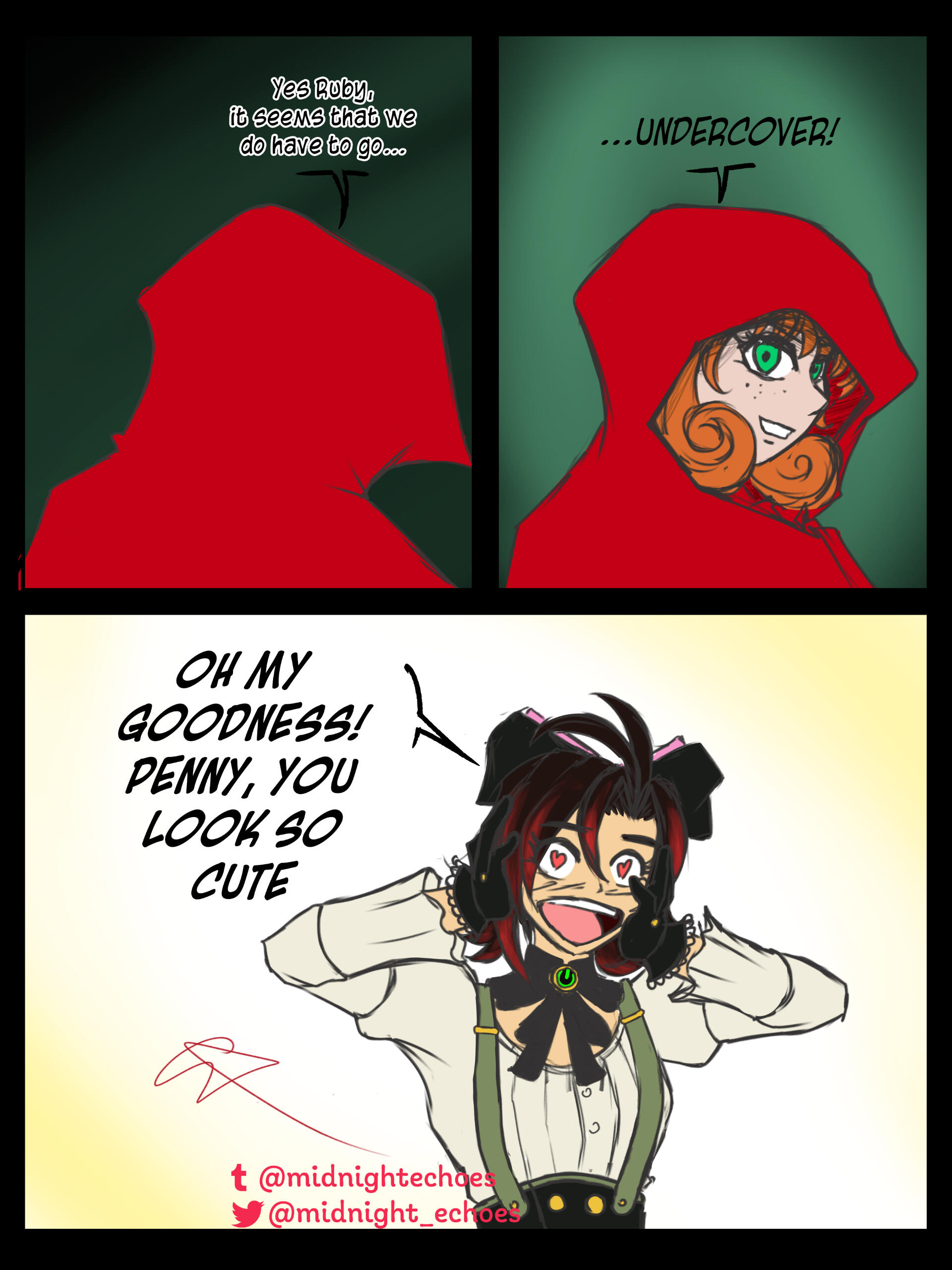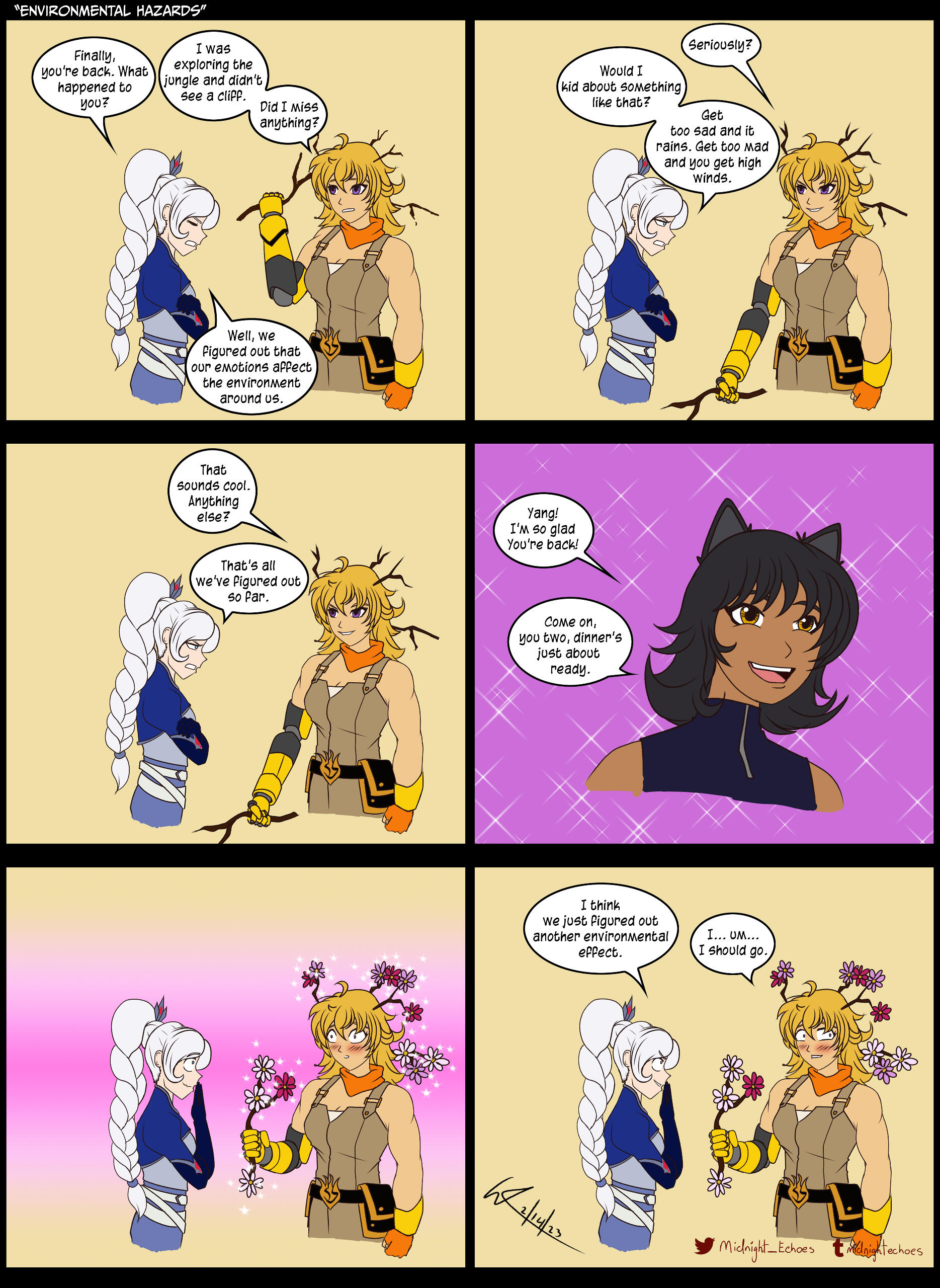 A collaboration comic that I made with my friend Loriela, she co-plotted the script of the comic and wrote the accompanying fic. Our best guess about Blake and Yang's reunion in volume 9 of RWBY.